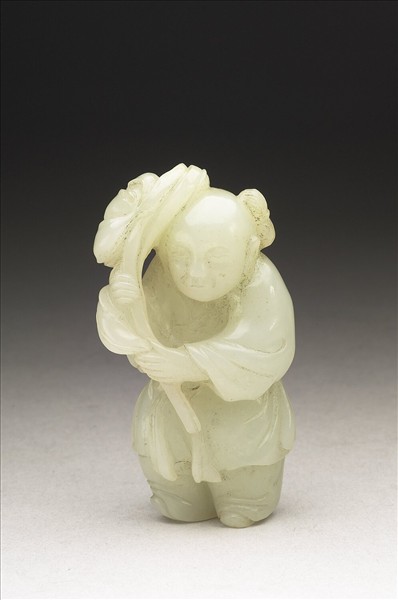 玉質,色青白。孩童雙手環於胸前,捧荷花束,花束高過童子,靠於前額,雙足微傾,造型逗趣。