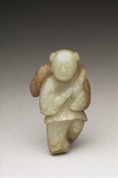 玉質,色灰白泛青,穀穗泛赭。孩童臉頰飽滿,笑容可掬,雙手合持穀穗,由左胸繞於身後,左足提舉,單腳站立,似乎想要表現奔跑之動態。
