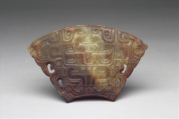 玉質,色青白表面大部分呈現赭紅色。片狀,扇面形,正面飾獸面紋,背面飾獸背紋。