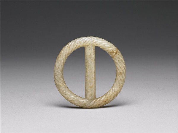 玉質,色灰白。中央有一縱桿,作為固定帶扣之用。器面琢一圈扭絲紋。