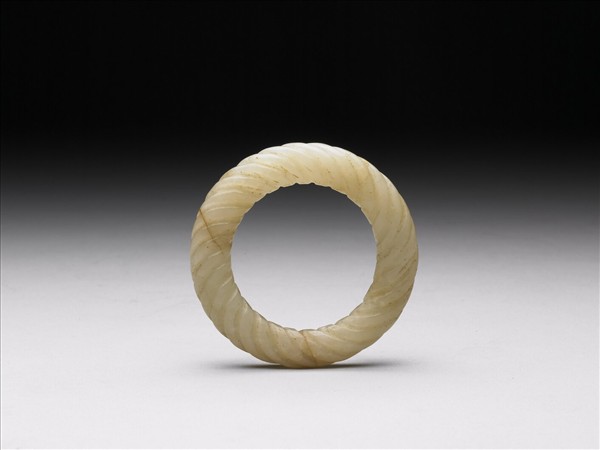 玉質,色灰白。形似鐲,器面琢一圈扭絲紋。一組兩件。