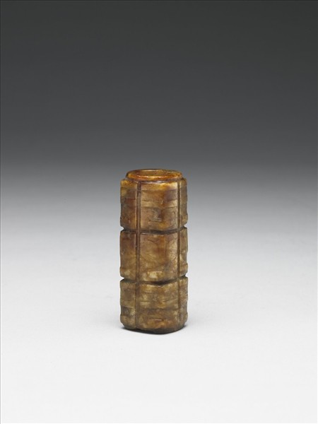 深淺交雜的赭色玉。方柱體的中段較粗,外壁圓弧形較明顯。中孔中段尚填塞泥塊,故未測比重。紋分三節,自上至下交替琢小眼、大眼面紋。花紋尚清晰。