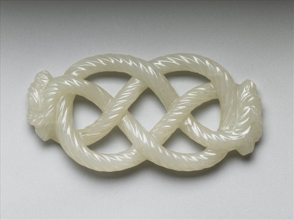 玉質,色白潤光潔。全件雕刻模擬雙環結繩,繩索纏繞交疊,二端結節,繩索絞絲線條表現細膩。本件收入乾隆時期製作多寶格「集瓊藻」中,據集瓊藻小冊所載原有二層七十三件,共儲於嵌飾獸骨螺甸的木箱中。