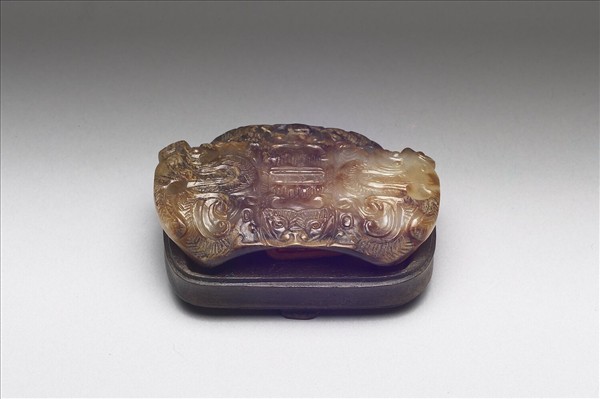 玉質,原應為白玉,現多沁染作深棕與橘紅相間。器呈瓦片狀,窄邊二端各雕飾一獸首,獸捲鼻雙長角,中段飾獸面紋與幾何式紋樣數組。附木座。本件收入乾隆時期製作多寶格「集瓊藻」中,據集瓊藻小冊所載原有二層七十三件,共儲於嵌飾獸骨螺甸的木箱中。