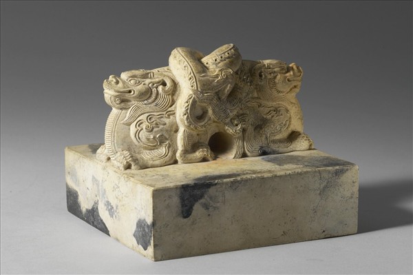 印面正方,頗巨,因埋藏之故,印石多呈灰白間黑,印面未刻,頂面有款「雍正二年十月江南提督高具位進(1724)」。印鈕作交纏雙龍,雕琢極精細,中有大穿孔。
