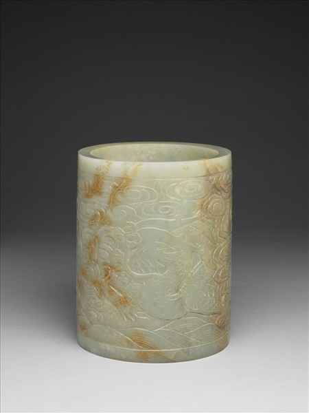 玉質,青白色雜褐斑。全器作圓筒形,平底微內凹。器壁琢淺浮雕雲龍戲珠,近底處飾波濤紋。