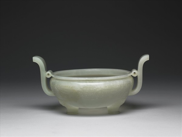 玉質,色灰白微泛青。平沿、鼓腹、蹄足,雙耳由腹側出往上侈,耳與口之間有圓環。器腹飾獸面紋,足飾獸首,底飾圓圈紋,與腹獸面綬帶交纏。