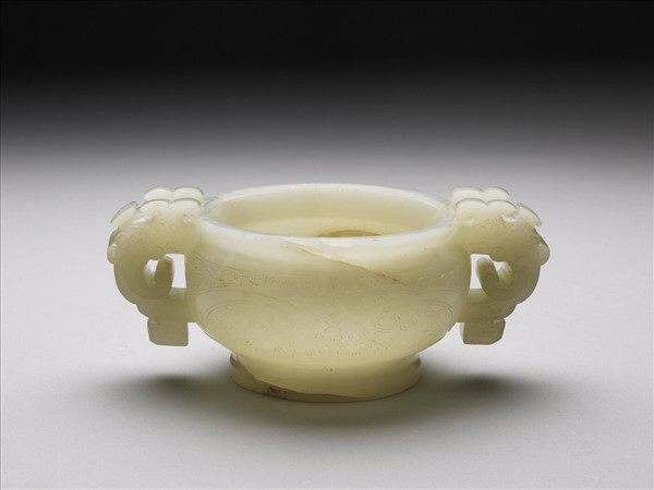 玉質,色白泛黃。平沿、獸耳帶珥、縮頸、弧腹、圈足,腹琢一圈獸面紋。