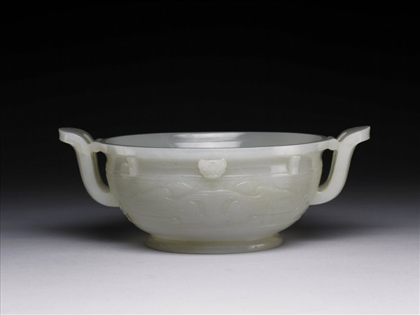 玉質,色灰白微泛青。平沿、縮頸、弧腹、圈足,朝冠耳。頸飾小獸面,有棱脊,腹以雷紋為地飾獸面紋。