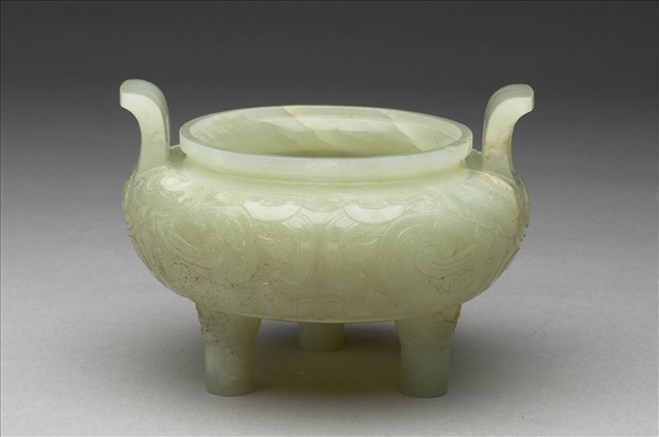 玉質,色灰白泛青。平沿、立耳、鼓腹、柱足,朝冠耳。腹飾淺浮雕獸面紋,並以雷紋為地紋,足飾獸首。