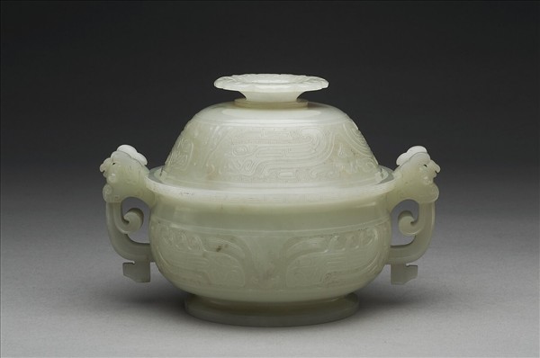 玉質,色灰白微泛青。附鈕蓋、子母口、縮頸、弧腹、圈足,耳作龍形附珥。蓋、腹均飾獸面紋,並以雷紋為地,蓋頂飾蓮瓣紋。