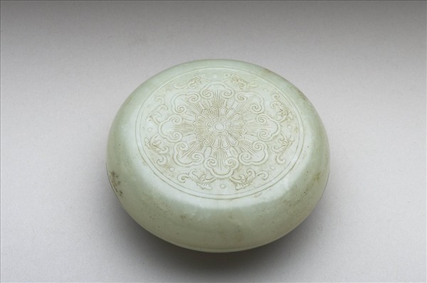 玉質,色灰白雜小黑斑。扁圓盒,附蓋、子母口、淺盤、圈足。蓋面飾一圈圓形紋,內飾一圈對稱花形紋,外為如意雲紋、卷葉紋。