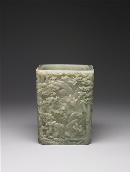 青玉質。採多層次去地深雕,多處透空。四方形。一面一景,景與景間以樹木、山石為區隔,連續不斷。眾仙人執笏、如意者有之,捧桃、金蟾者有之,面容細緻,姿態自然。底琢碾山壁湧泉。