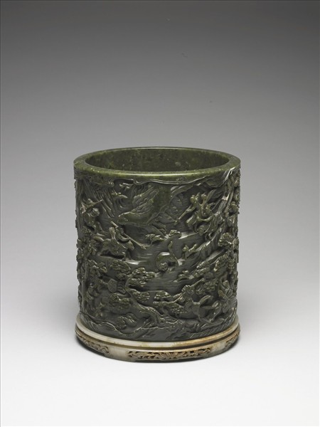 碧玉質,碧綠色。圓筒形,外壁浮雕題為「秋山獵騎」的場景圖,山石嶙峋,獵人騎馬狩獵、動物奔馳,都雕琢得栩栩如生。口沿刻壬寅年(四十七年,1782)乾隆御製詩,詩文內容在描述山中獵騎的活動,與紋飾圖案相符。
