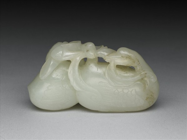 青玉。全器略呈橢圓形,雕作蹲坐雙鵝,兩兩相對,並口啣蓮花。於鵝腹部以陰線淺刻飾羽毛。