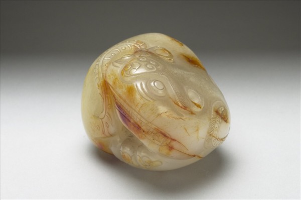 玉質,局部染黃赭斑。器表雕琢圖案化虎紋。