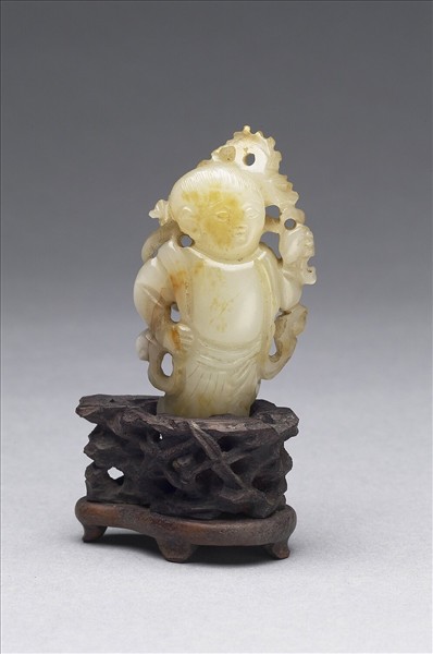 白玉,通體有赭斑。全器玉料略呈扁橢圓形,雕作一童子,左手持植物枝葉,枝葉作鏤雕,與衣帶一同繞過肩膀,右手插腰,雙腳交叉而立。附木座。