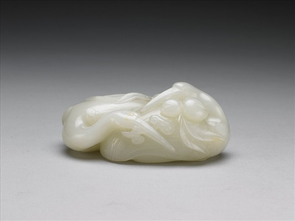 白玉,玉色瑩白。全器作大小相依之雙鶴,皆為蹲座姿態,並口啣桃枝與靈芝。以陰線淺刻飾鳥羽,底部並浮雕作鵝腳。