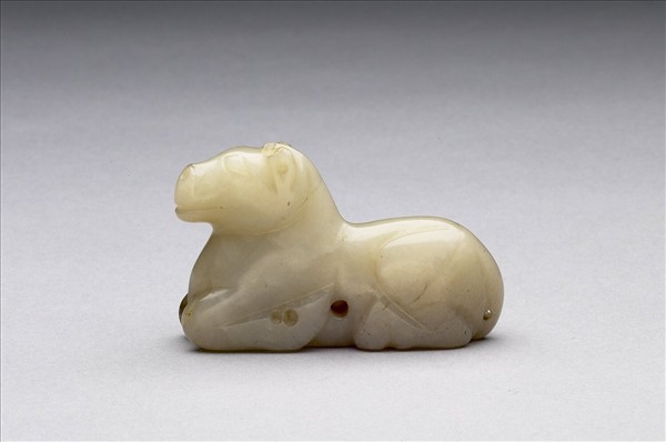 青玉,玉色泛黃,有赭斑。全器為一立雕馬,做跪坐姿態。以陰刻線表示馬首與後腿。腹部有一通心穿,頭部、尾部、及前胸各有一象鼻穿,左前腿有兩個小孔。