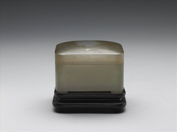 盒,玉色泛赭黃。全器為方形,有蓋、直壁,平底下有四足。盒身四角略呈圓弧形狀。附木座。