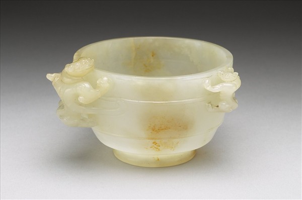 玉質純潤。杯形,有圈足,杯身上下兩圈細弦紋,杯口聳出二螭頭。杯身局部有淡褐紅盤斑。