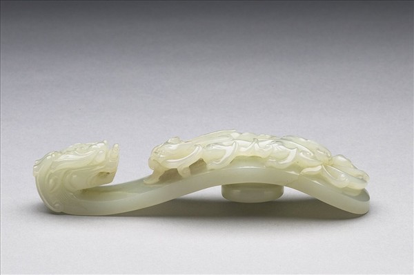 白玉,玉色泛白。鉤作龍首式,面高浮雕螭紋,背琢圓柱。