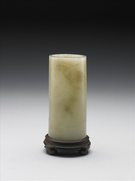 青玉,玉色泛黃。全器為圓筒狀,直口、直壁、平底。附木座。