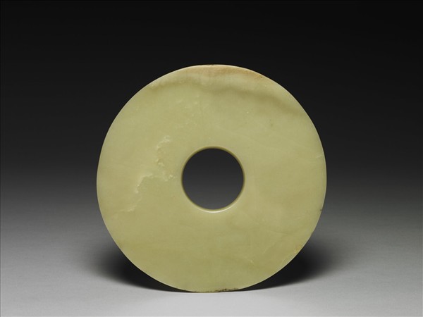 灰青帶黃玉質,溫潤泛光澤,一端玉色變化即屬糖包白玉料的規律性變化。圓璧形工整。器面最厚端與最薄端相對應,單面鑽孔。