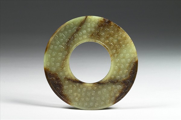 玉質,色略黃。器兩面均琢近似穀紋之雲紋,並以雷紋為地。平廓,廓線圓整。