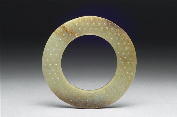 青玉,局部有淡褐色沁,半透明。不甚圓整,有廓,廓窄且均等;中孔似乎為單面鑽作,鑽作不齊,後加磨飾;器面上刻飾穀紋。