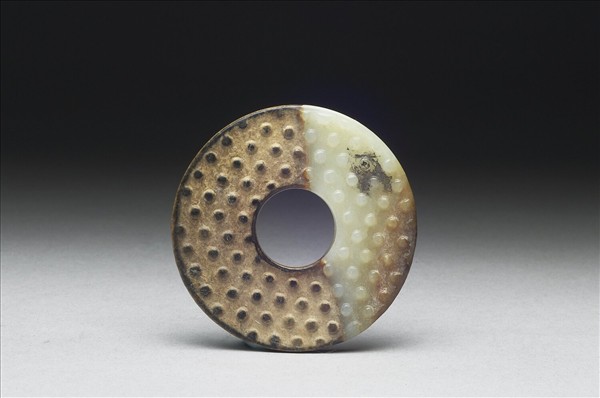 玉質。器之半部已沁成灰赭色,其一面雕有乳丁紋,另一面則琢飾幾何連續紋飾。