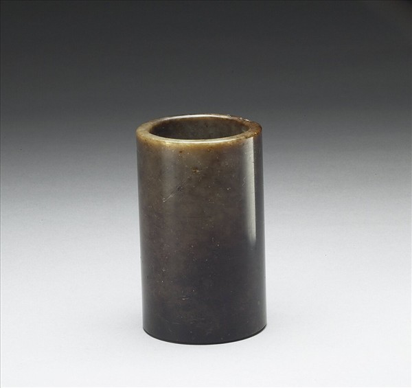 玉質,深墨綠近黑色,器口有黃赭色斑。作一直筒狀,全器樸素無紋飾,器內底部有圓槽,似為嵌飾於他器之物。