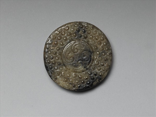 玉劍首、劍鐔、劍璏、劍摽合稱「玉具劍」,漢代武人帶劍,較講究者均於銅劍或鐵劍以及劍鞘上裝飾此類劍飾。劍首是嵌飾於劍柄末端的飾物,其形圓,正面琢飾穀紋、雲紋等,背面做一圓凹槽,便於嵌於劍柄末端。此件劍首是典型的漢代風格之物。