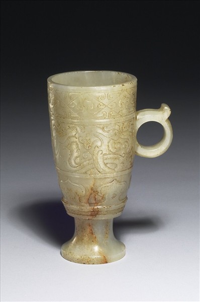 閃玉。表面多處褐斑及浸蝕痕跡,部份疑似人為的致殘作沁。形仿漢代高足杯。紋飾分三層帶狀,亦仿漢代流行花樣,中層尤其有趣,乍看像舒卷的雲氣,細看又似交錯的簡化龍紋,游移於無心疏漏與故意裁減間。因此,暫且將此杯視為一件相當理解漢代風格之高手的仿古作品,但不完全排除是經過人工強化沁染效果、非典型的漢朝玉器。 就品味養成的角度而言,此杯的木盒相當重要。盒上除刻雲龍捧「聖」珠紋外,四壁則鐫約成於乾隆十八年(1753)的御製文〈玉盃記〉,內容敘高宗與如意館玉匠姚宗仁(約活動於18世紀),共賞宗仁祖父所做之偽古漢玉盃的經過。文末乾隆特嘉許姚宗仁,陳述偽古玉染色作舊之法的一番話乃「近理之談」;「執藝以諫」,高宗亦不諱言「常以藝事諮之」,可見對其看重。目前台北及北京故宮計有六件玉器,所附盒匣、底托、冊頁,或刻或寫〈玉盃記〉。本院典藏的兩件,編號「故玉2791」者已多次發表,本次特選另一件展出。不論何者才是故事真正的主角,乾隆皇帝將同一篇文字,多次套用於不同的物件上,顯示該次對談,必然開啟他品鑑玉器的眼界,故回味再三。可見皇帝品味之養成,有學養的宮廷匠人具有十分深刻的影響力。