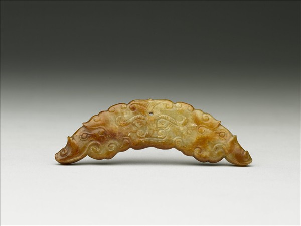 青黃色玉,周身赭斑呈黃赭色。器形如璜但較平直,中間寬向二邊收,中央琢一獸面,大眼敞鼻,二端為龍首,器緣作雲流狀起伏,中間穿有一孔,可以掛佩。