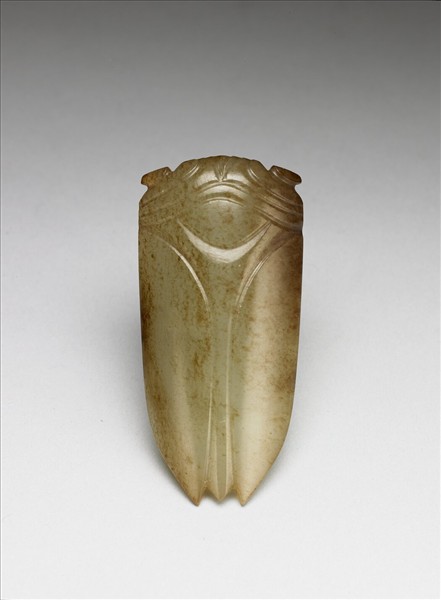 玉質。周身有淺赭斑,為漢代最習見之蟬形,無穿,為唅歛之器。