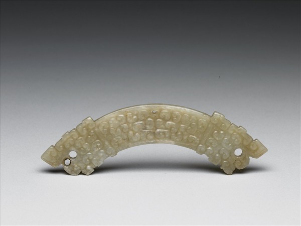 玉質,微有赭斑。器近璜形而較平直,器身滿琢雲紋為飾,中間上下邊及龍口處亦琢飾繩紋。兩端作龍首,器有三穿,一在器正中上方處,另兩穿在龍口。