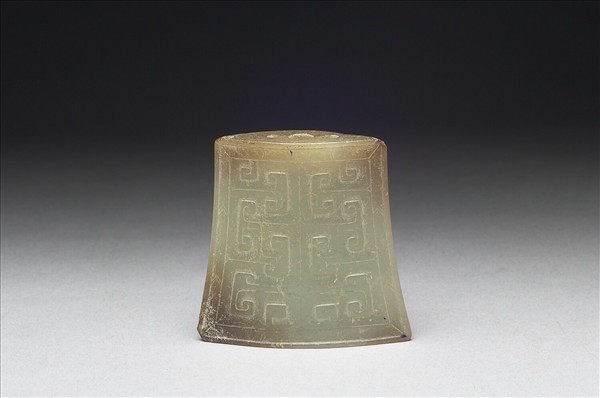 玉質。有赭斑,兩面均琢雲紋為飾,器頂有一圓槽及二穿。