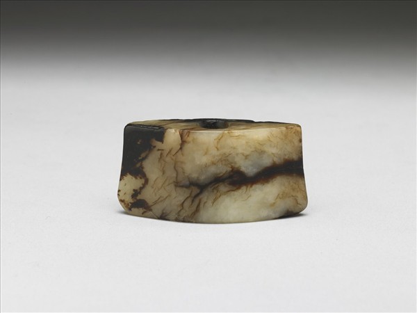 玉質。有黑赭色斑,器面光素無紋,器頂有一圓槽。