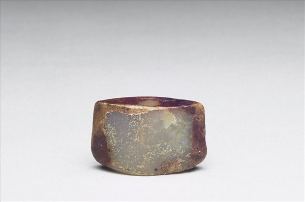 玉質。有赭斑,器形較小,器面光素無紋,器頂有一圓槽,圓槽孔徑稍大。