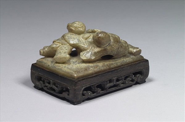 玉質,局部沁白。琢一板上有二小兒之狀,小兒共抱一球嬉戲,兩人皆側身伏臥,狀極生動。附清代木座。