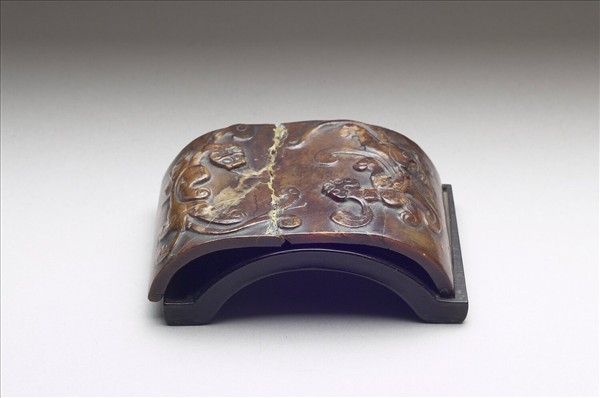 玉質。器作覆瓦形,曲覆為半橢圓狀,表面兩旁分琢二螭曲首相對,器底琢有乾隆大篆銘文。
