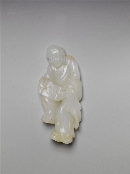 白玉,整器雕作坐姿人像,其人禿頂高額而面目含笑,雙手正展開一手卷而視,手卷上有太極圖樣。本器原為玉石盆景上之附件,故人像雖是坐姿,但未見其所坐之物,且相對於右肩右腳,左肩左腳較為突出,是視角斜視坐者的遠近表現法。同類之玉石小雕像尚有七件,但玉石枝幹已碎裂,故獨立成件。