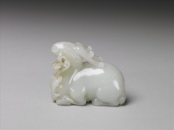 白玉,整器雕成一鹿,該鹿作蹲伏之姿,昂首口啣花葉,故花葉自然垂於胸前,鹿角明顯,但無論是鹿角或身軀,多雕成較圓弧樣式呈現,且又打磨細潤,使整器有柔潤溫和的韻味。本器原為玉石盆景上之附件,同類之玉石小雕像尚有七件,但玉石枝幹已碎裂,故獨立成件。