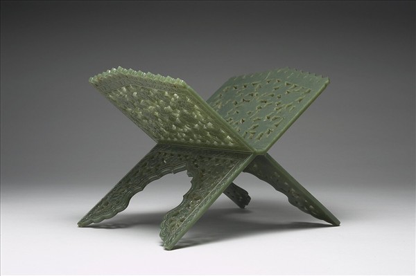 碧綠玉,琢作可張可合的古蘭經架。器表鏤雕各式花葉紋,沿著輪廓以淺浮雕花葉紋的裝飾帶圍繞一周。一足有傷缺。