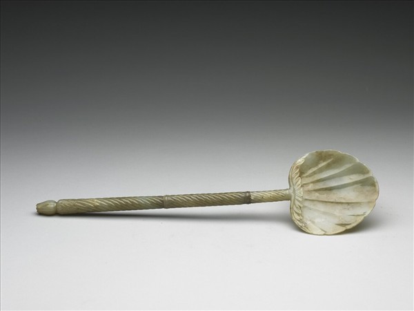 青玉帶大片淺褐色斑。琢作長柄杓。杓面雕作寬葉形,葉柄處浮雕莨苕葉紋。長柄由三截接成,雕扭絲紋。柄端雕一蓓蕾。華麗大方。原即配有織錦製成的器座及印花布套。清宮中稱這種布套為「回子布套」,可能是新疆回部做的,也可能是清宮造辦處用「回子布」縫製的。