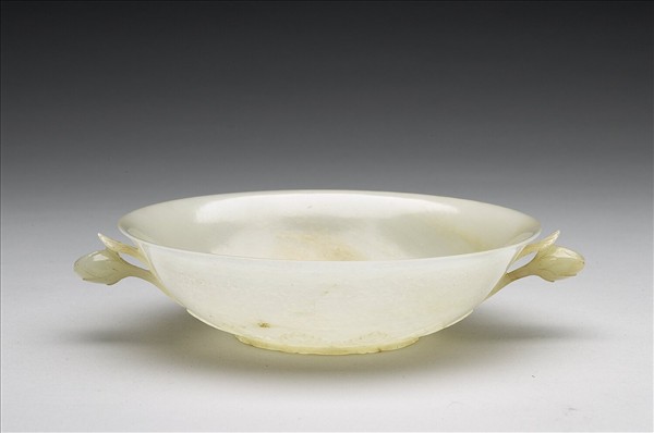 白玉局部淺棕色斑。琢作一撇口淺腹的圓碗,碗底雕琢一平展的三層八瓣花卉。周圍繞一圈莨苕葉。自兩側下方沿著腹壁向上伸長莨苕葉至口沿處,輕觸自葉梗分出之花蕾。