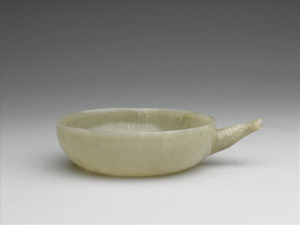 玉質,琢一淺圓碗,碗口微斂,器壁微厚,平底,帶一雕琢葉紋的扁圓形「流」。此器形應是為了盛裝流質食物,供人直接以嘴就流啜食用的。