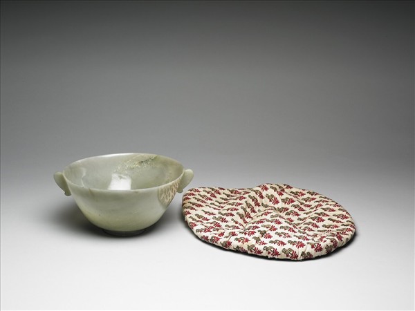 玉質,有白斑及灰色斑紋。敞口,斜壁,兩耳,有圈足。耳作板狀魚形。為痕都斯坦風格玉器。附束繩繡花布套。