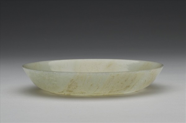 玉質,帶有赭斑。弧形淺壁,底微凹。壁薄可透光。附束繩繡花布套,有黃籤。